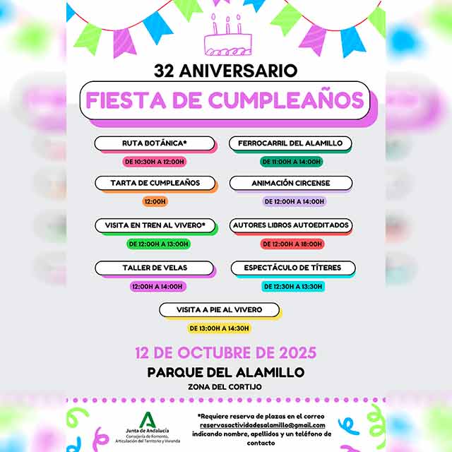 Qué: el domingo 12 de octubre de 2025 se celebrará el trigésimo segundo aniversario del Parque del Alamillo con una fiesta de cumpleaños en la zona del Cortijo del Parque del Alamillo de Sevilla. Se han organizado distintas actividades y rutas gratuitas para la ocasión. Consulta la
