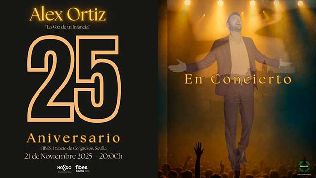 OnSevilla. El viernes 21 de noviembre de 2025 estará en concierto en Sevilla Álex Ortiz en el auditorio del Palacio de Exposiciones y Congresos de Sevilla (Fibes). El cantante sevillano celebrará el veinticinco aniversario de carrera profesional con un espectáculo titulado "La voz de tu infancia" en el que homenajeará a la capital hispalense. La trayectoria del artista incluye temas musicales de pop, flamenco-pop, bachata, sevillanas y saetas además de la canción oficial del Equipo Nacional de la Copa Davis de tenis, entre otros. Consulta la agenda completa de conciertos en Sevilla.