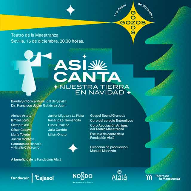 OnSevilla. El lunes 15 de diciembre de 2025 el Teatro de la Maestranza de Sevilla acogerá la sexta edición del concierto "Así canta nuestra tierra en Navidad". Este año tendrá como artistas invitados a Ainhoa Arteta, Ismael Jordi, Siempre Así, César Cadaval, María Toledo, Cantores de Híspalis y Natalia Calceteiro, Junior Míguez y La Flaka, Rosario La Tremendita, Lucas Paulano, Julia Garrido y Milián Oneto; la Banda Sinfónica Municipal de Sevilla, Gospel Sounds Granada y el Coro del Teatro de la Maestranza. Manuel Marvizón será el director de producción de este espectáculo a beneficio de la Fundación Alalá que organiza la Fundación Cajasol. Consulta más actividades durante esta Navidad en Sevilla y la agenda completa de conciertos en Sevilla.