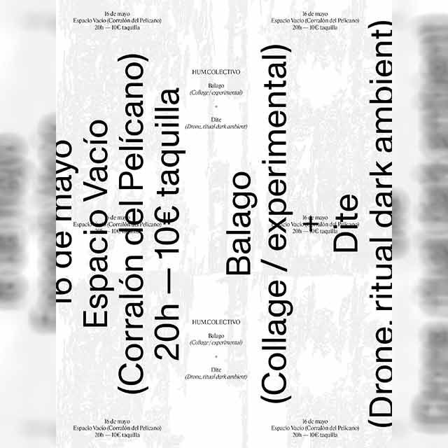 Qué: el sábado 16 de mayo de 2026 estarán actuando los grupos Balago y Dite en el Espacio Vacío de Sevilla. El colectivo HUM! ha organizado este concierto en el que se podrá escuchar a los barceloneses Balago (collage, experimental) y a los sevillanos Dite (drone, ritual dark ambient). Consulta la agenda completa de conciertos en Sevilla.