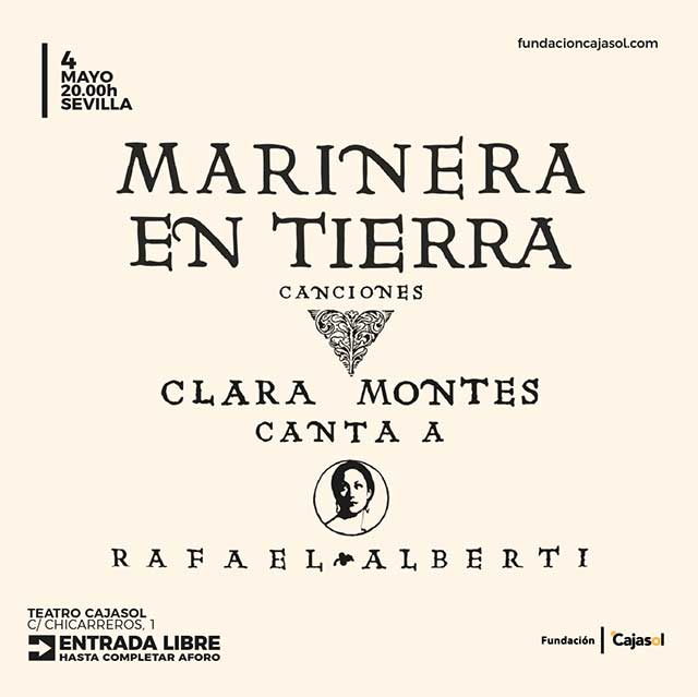 Qué: el lunes 4 de mayo de 2026 estará en concierto Clara Montes en el Teatro de la sede de la Fundación Cajasol en Sevilla. La artista madrileña presentará su último trabajo discográfico titulado "Marinera en tierra", en el que homenajea al poeta gaditano Rafael Alberti. Consulta la agenda completa de conciertos en Sevilla.