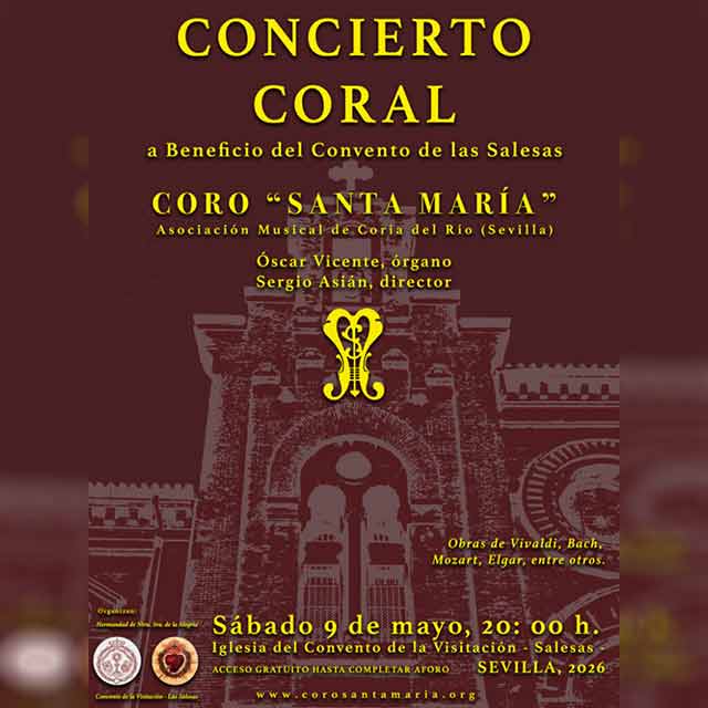 Qué: el sábado 9 de mayo de 2026 habrá un concierto coral benéfico en la iglesia del convento de la Visitación (las Salesas) de Sevilla. Contará con la actuación del Coro "Santa María" de la Asociación Musical de Coria del Río, Óscar Vicente al órgano y la dirección de Sergio Asián. Se interpretarán obras de carácter mariano y eucarístico de Antonio Vivaldi, Johann Sebastian Bach y Wolfgang Amadeus Mozart, entre otros. Será a beneficio del propio convento de las Salesas. Consulta la agenda completa de conciertos en Sevilla.