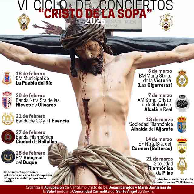 Qué: del miércoles 18 de febrero al sábado 21 de marzo de 2026 se celebrará la sexta edición del ciclo de conciertos "Cristo de la Sopa" en la iglesia del Santo Ángel de Sevilla. Durante la Cuaresma se podrá escuchar a distintas formaciones musicales de la capital y la provincia. La recaudación del ciclo, organizado por la Agrupación del Santísimo Cristo de los Desamparados y María Santísima de la Salud y la comunidad carmelita del Santo Ángel de Sevilla, se destinará al proyecto de caridad con la Residencia de San Juan de Dios. Consulta la