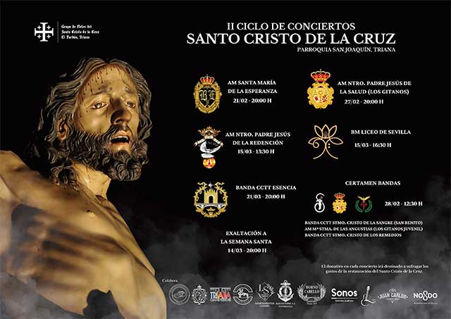 Qué: del sábado 21 de febrero al sábado 21 de marzo de 2026 tendrá lugar la segunda edición del ciclo de conciertos "Santo Cristo de la Cruz" en la iglesia de San Joaquín de Triana en Sevilla. En ella participarán distintas agrupaciones musicales en un total de cinco conciertos. De forma paralela se celebrará el Certamen de bandas el sábado 28 de febrero. Consulta la
