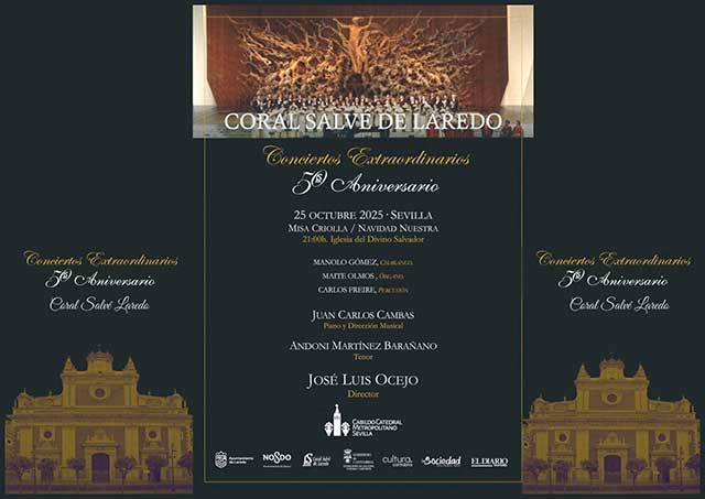 Qué: el sábado 25 de octubre de 2025 se podrá asistir a un concierto de la Coral Salvé de Laredo en la iglesia colegial del Divino Salvador de Sevilla. La formación celebrará su 50 aniversario interpretando la "Misa criolla" de Ariel Ramírez, distintos temas navideños y de folclore argentino e hispanoamericano. Consulta la agenda completa de conciertos en Sevilla.