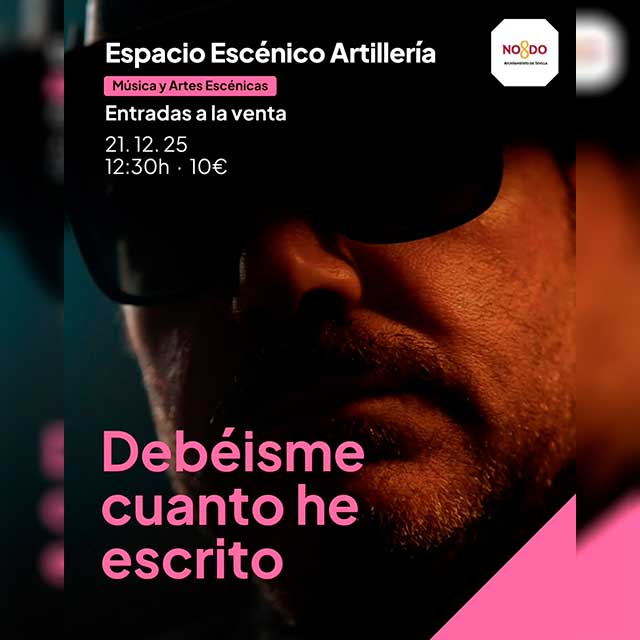 Qué: el domingo 21 de diciembre de 2025 se ha programado el espectáculo "Debéisme cuanto he escrito" en el espacio escénico de la Real Fábrica de Artillería de Sevilla. Se trata de una lectura de la obra de Antonio Machado con espacio sonoro en homenaje por el 150 aniversario de su nacimiento. Creado por Julio Béjar y Fran Elara. Consulta la agenda con otras actividades en Sevilla.