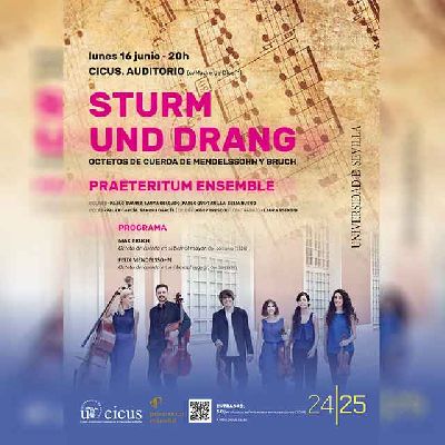 OnSevilla. El lunes 16 de junio de 2025 estará tocando en Sevilla el grupo Ensemble Praeteritum en el Centro de Iniciativas Culturales de la Universidad de Sevilla (CICUS). En el concierto interpretarán el programa titulado "Sturm und drang" integrado por obras de los compositores alemanes Max Bruch ("Octeto de cuerda en si bemol mayor, Opus Póstumo") y Felix Mendelssohn ("Octeto de cuerda en mi bemol mayor, Opus 20"). Ensemble Praeteritum estará formado por Pablo Suárez (violín y director artístico), Laura Delgado, Pablo Quintanilla y Celia Bueno (violines), Paula García y Sandra García (violas), Josep Trescolí (violonchelo) y Laura Asensio (contrabajo). Consulta la agenda completa de conciertos en Sevilla.