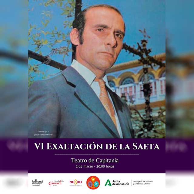 Qué: el lunes 2 de marzo de 2026 tendrá lugar la sexta edición de la "Exaltación de la Saeta" en el teatro de la Capitanía General de Sevilla. En esta ocasión se realizará un homenaje al saetero Jesús Heredia Flores. La ceremonia estará a cargo de Juan Miguel Vega Leal y presentada por Alberto García Reyes (director de ABC de Sevilla). Contará con la presencia de los artistas Rosario "La Tremendita", Manuel Monje y David Carpio así como de la Banda Sinfónica Municipal de Sevilla. Consulta la agenda completa de conciertos en Sevilla, la de flamenco en Sevilla y la de Semana Santa de Sevilla.