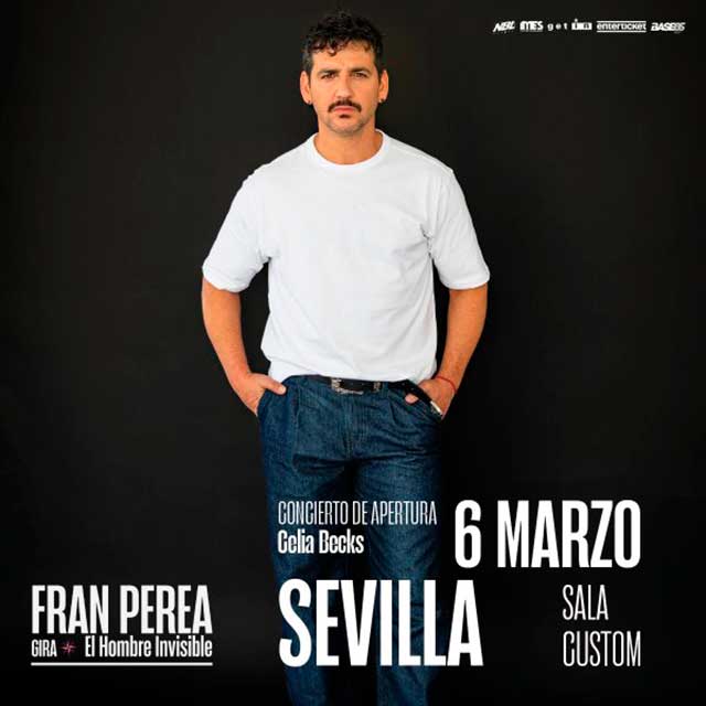 Qué: el viernes 6 de marzo de 2026 habrá una actuación de Fran Perea en la Sala Custom de Sevilla. El concierto forma parte de la gira de presentación de "El hombre invisible", su último disco, que publicará el próximo 6 de febrero. Celia Becks (ex La La Love You) será la artista invitada. Consulta la agenda completa de conciertos en Sevilla.