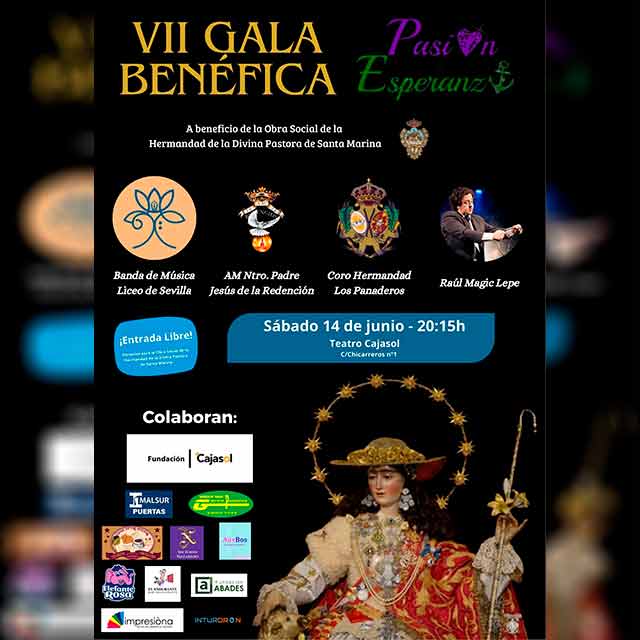 Qué: el sábado 14 de junio de 2025 se celebrará la séptima edición de la "Gala Benéfica Pasión y Esperanza" en el Teatro de la Fundación Cajasol en Sevilla. Actuarán la Banda de Música Liceo de Sevilla, la Agrupación Musical Nuestro Padre Jesús de la Redención, el Coro de la Hermandad de Los Panaderos y Raúl Magic Lepe a beneficio de la Obra Social de la Hermandad de la Divina Pastora de Santa Marina. Consulta la agenda con otras actividades en Sevilla.