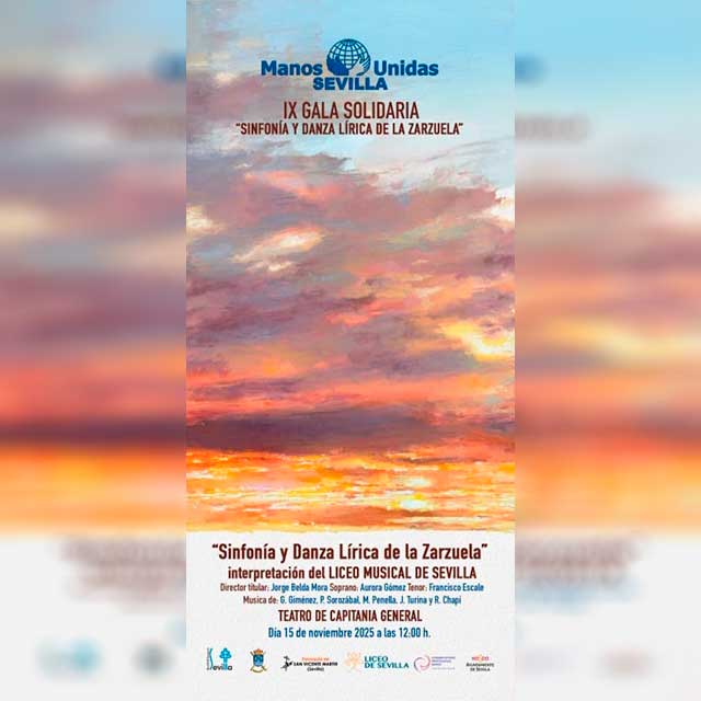 Qué: el sábado 15 de noviembre de 2025 se podrá asistir a la novena edición de la Gala Solidaria de Manos Unidas en el Teatro de Capitanía General de Sevilla. Se ha titulado "Sinfonía y danza lírica de la zarzuela" y estará interpretada por el Liceo Musical de Sevilla. Contará con la participación de la soprano Aurora Gómez, el tenor Francisco Escala y alumnos del Conservatorio Profesional de Danza Antonio Ruiz Soler. Consulta la cartelera de espectáculos en Sevilla.