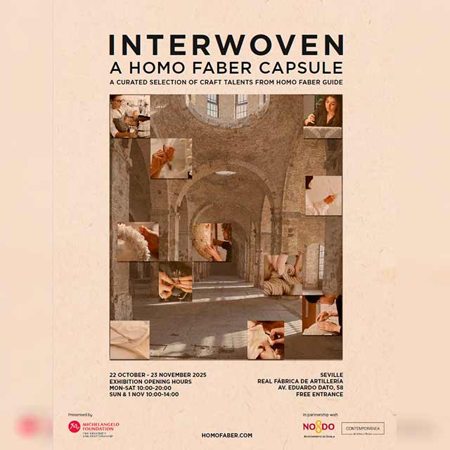 OnSevilla. Del miércoles 22 de octubre al domingo 23 de noviembre de 2025 se podrá visitar la exposición "Interwoven" en la Real Fábrica de Artillería de Sevilla. Se trata de una propuesta de la fundación suiza Michelangelo Foundation for Creativity and Craftsmanship en la que se reúne una selección de piezas artesanales realizadas por talentos internacionales en multitud de disciplinas, materiales y técnicas como vidrio soplado, encajes, porcelana, joyas y cerámica, entre otros. Está organizada en colaboración con el Ayuntamiento de Sevilla y la Asociación Contemporánea de Artes y Oficios (ACAO). Consulta la agenda completa de exposiciones en Sevilla.
