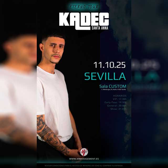 Qué: el sábado 11 de octubre de 2025 estará en concierto Kadec Santa Anna en la Sala Custom de Sevilla. El artista barcelonés de emo rap comenzó su carrera en el año 2017. La actuación forma parte de la gira "Eterno Tour". Consulta la agenda completa de conciertos en Sevilla.