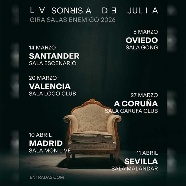 Qué: el sábado 11 de abril de 2026 se celebrará una actuación del grupo La Sonrisa de Julia en la Sala Malandar de Sevilla. El concierto es parte de la gira por salas "Enemigo 2026" en la que presentarán su séptimo álbum de estudio titulado "Enemigo", que saldrá a la venta en el mes de febrero de 2026, su primer disco en siete años. Consulta la agenda completa de conciertos en Sevilla.