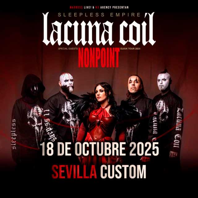 Qué: el sábado 18 de octubre de 2025 estará actuando la banda Lacuna Coil en la Sala Custom de Sevilla. El grupo de metal italiano visitará tres capitales españolas, incluida la hispalense, para presentar su nuevo disco titulado "Sleepless empire", que publicaron el pasado mes de febrero. Consulta la agenda completa de conciertos en Sevilla.