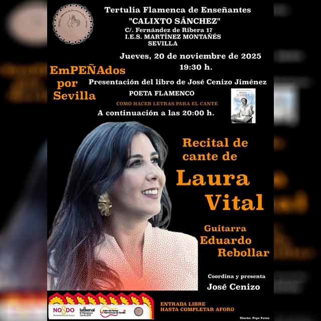 Qué: el jueves 20 de noviembre de 2025 Laura Vital estará en concierto en la Tertulia Flamenca de Enseñantes Calixto Sánchez de Sevilla. La cantaora estará acompañada por Eduardo Rebollar a la guitarra. La actuación es parte del ciclo "EmPEÑAdos por Sevilla". Consulta la agenda completa de conciertos en Sevilla y la de flamenco en Sevilla.