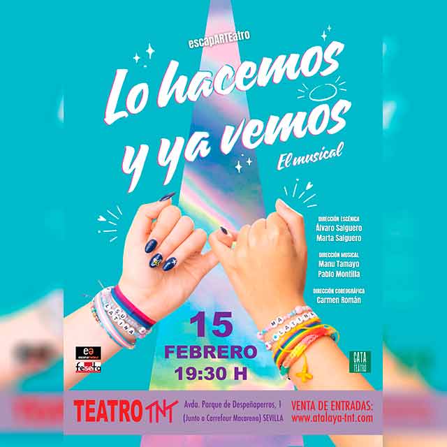 Qué: el domingo 15 de febrero de 2026 se representará "Lo hacemos y ya vemos" en el Teatro TNT de Sevilla. Se trata de un musical de la compañía sevillana escapARTEatro dirigido por Ávaro y Marta Salguero (escena), Manu Tamayo y Pablo Montilla (música) y Carmen Román (coreografía). Consulta la cartelera de teatro en Sevilla.