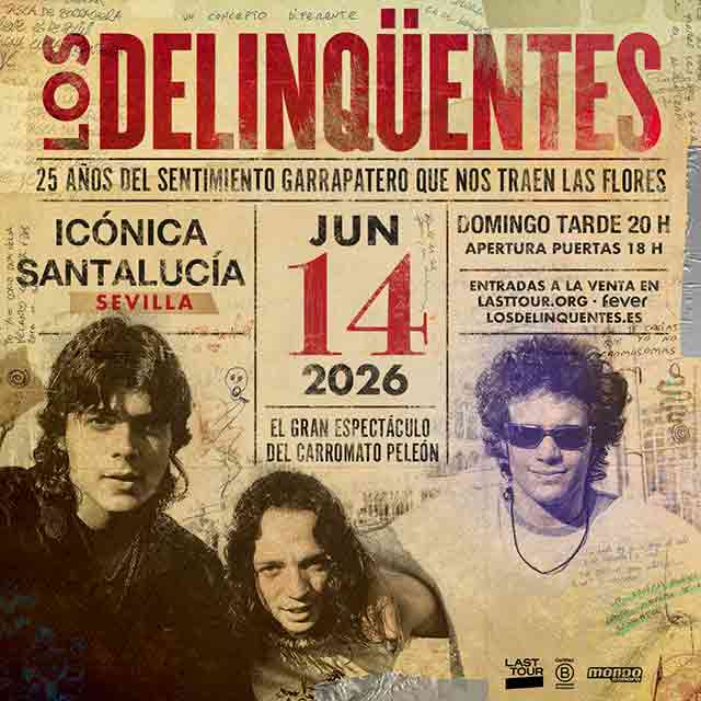 OnSevilla. El domingo 14 de junio de 2026 se ha programado un concierto de Los Delinqüentes en la Plaza de España de Sevilla. La banda formada por El Canijo de Jerez, Diego "Ratón" y Er Migue, fallecido en 2004, celebrará el vigésimo quinto aniversario de su primer trabajo discográfico "El sentimiento garrapatero que nos traen las flores" interpretando todos sus temas en directo. La voz y la imagen de El Migue se podrán ver y escuchar junto a la de sus compañeros proyectándose en una pantalla gigante. La actuación está incluida dentro de la sexta edición del festival Icónica Santalucía Sevilla Fest 2026. Consulta la agenda completa de conciertos en Sevilla.