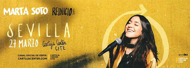 OnSevilla. El viernes 27 de marzo de 2026 se ha programado un concierto de Marta Soto en la Sala CITE del Cartuja Center CITE de Sevilla. La cantautora onubense nació en Punta Umbría en noviembre de 1996. Se dio a conocer en las redes sociales con versiones de canciones. La artista actuará en nuestra ciudad dentro de la gira titulada "Reinicio Tour" en la que presentará su nuevo trabajo discográfico "Reinicio", que saldrá a la venta a mediados del mes de enero. Consulta la agenda completa de conciertos en Sevilla.