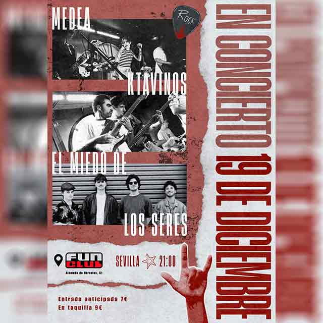 Qué: el viernes 19 de diciembre de 2025 habrá un concierto de las bandas Medea, Ktavinos y El miedo de los seres en la Sala FunClub de Sevilla. El cartel está integrado por formaciones andaluzas: las sevillanas Medea y Ktavinos tocan rock y pop y la malagueña de Benalmádena El miedo de los seres su estilo post-punk-grunge. Consulta la agenda completa de conciertos en Sevilla.