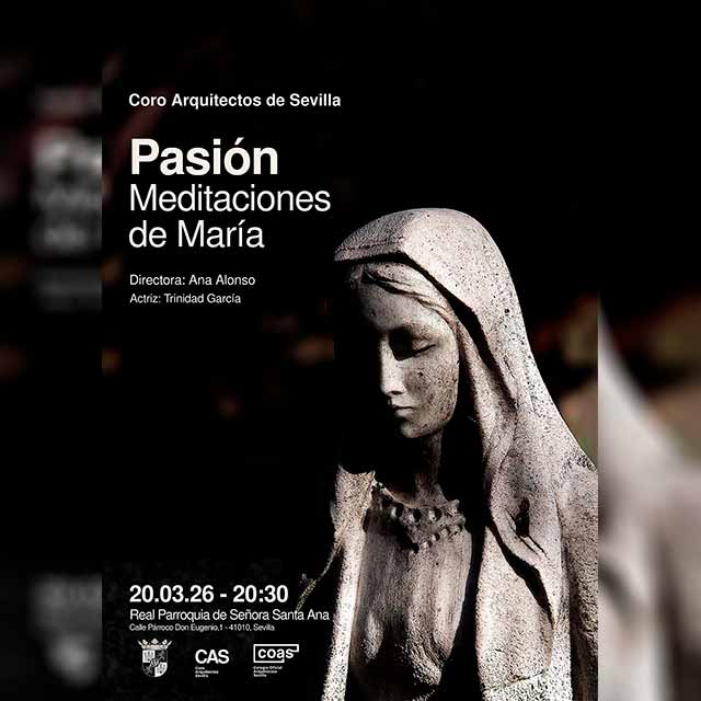 Qué: el viernes 20 de marzo de 2026 se podrá asistir al concierto "Pasión. Meditaciones de María" en la iglesia de Santa Ana de Sevilla. Estará interpretado por el Coro de Arquitectos de Sevilla (CAS) dirigido por Ana Alonso y contará con la participación de la actriz Trinidad García. El programa estará compuesto por principalmente por obras de Johann Sebastian Bach. Consulta la agenda completa de conciertos en Sevilla y más actividades de Semana Santa.