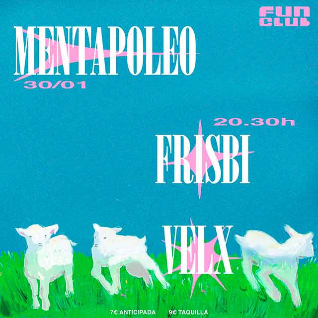 Qué: el viernes 30 de enero de 2026 estarán actuando Mentapoleo, Frisbi y Velx en la Sala FunClub de Sevilla. El primero es un trío de Barcelona, los segundos y los terceros, ambos sevillanos, son grupos de power pop y rock respectivamente. Consulta la agenda completa de conciertos en Sevilla.