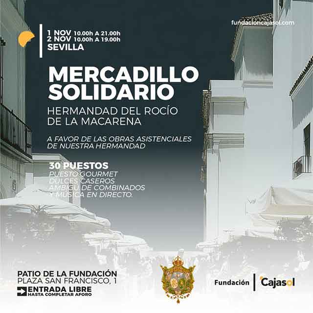 Qué: el sábado 1 y el domingo 2 de noviembre de 2025 se ha organizado un mercadillo solidario en el patio de la Fundación Cajasol en Sevilla. Será a beneficio de las obras asistenciales de la Hermandad del Rocío de la Macarena. Contará con música en directo y treinta puestos con productos gourmet y dulces caseros, entre otros. Consulta la agenda con otras actividades en Sevilla.
