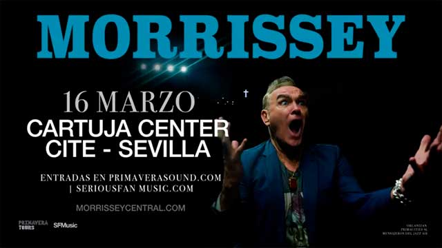 OnSevilla. El lunes 16 de marzo de 2026 se celebrará un concierto de Morrissey en el auditorio del Cartuja Center CITE de Sevilla. El cantante y compositor británico, nacido en el mes de mayo de 1959, comenzó su carrera en los años ochenta en el grupo The Smiths. En el año 1988 empezó su andadura en solitario con la publicación del disco titulado "Viva Hate". La actuación forma parte de su gira española 2026 que ha sido coproducida por el festival Primavera Sound y SFMusic. Consulta la agenda completa de conciertos en Sevilla.