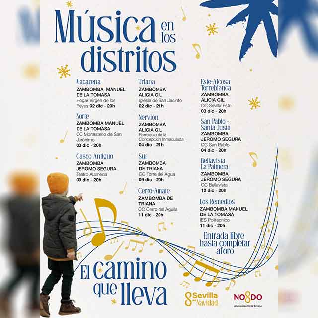 Qué: del martes 2 al jueves 11 de diciembre de 2025 se desarrollará el ciclo "Música en los distritos" en distintas zonas de la ciudad de Sevilla. Los martes, miércoles y jueves se celebrarán diferentes zambombas en un total de once conciertos en espacios como el Hogar Virgen de los Reyes, la iglesia de San Jacinto de Triana, el Centro Cívico Monasterio de San Jerónimo, entre otros. Consulta la