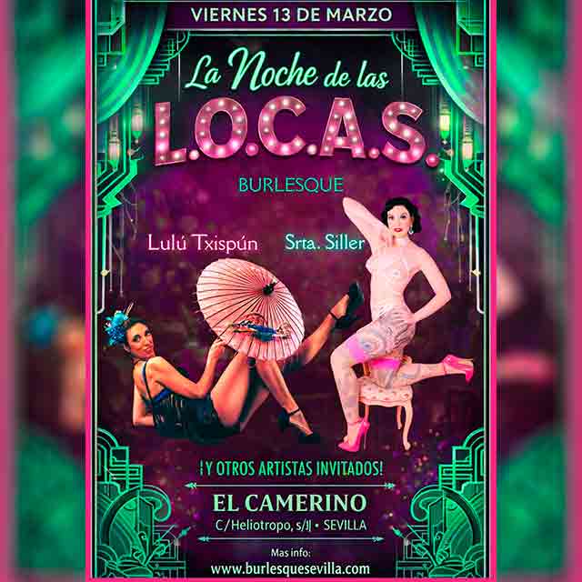 Qué: el viernes 13 de marzo de 2026 se ha programado "La noche de las L.O.C.A.S." en el espacio El Camerino de Sevilla. Se trata de un espectáculo de cabaret profesional de burlesque en el que actuarán Lulú Xispún y Srta. Siller, entre otras. Consulta la cartelera de espectáculos en Sevilla.