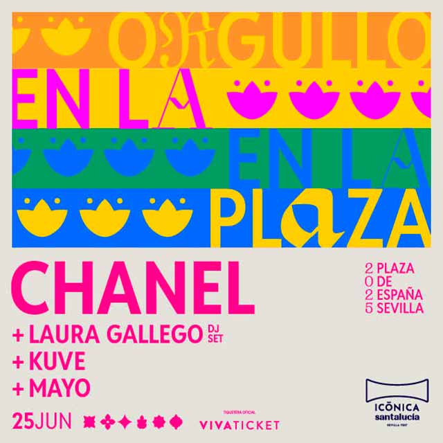 OnSevilla. El miércoles 25 de junio de 2025 se celebrará "Orgullo en la plaza" en la Plaza de España de Sevilla. Está organizado en colaboración con el Ayuntamiento y contará con la actuación de varios artistas. Abrirá el cartel la representante de España en Eurovisión en el año 2022 Chanel, que publicará su próximo tema "Una bala" el 6 de junio. También subirán al escenario la gaditana Laura Gallego con un DJ set de flamenco y electrónica, la murciana Maryan Frutos con su proyecto Kuve, y el sevillano Mayo con un estilo que combina el pop con lo urbano. Está incluido dentro de la programación de la quinta edición del festival Icónica Sevilla Fest 2025. Consulta la agenda completa de conciertos en Sevilla.
