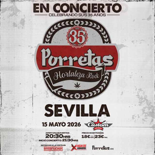 Qué: el viernes 15 de mayo de 2026 habrá una actuación de la banda Porretas en la Sala Custom de Sevilla. El concierto de la formación madrileña pertenece a la gira de celebración del trigésimo quinto aniversario de la creación del grupo. Consulta la agenda completa de conciertos en Sevilla.