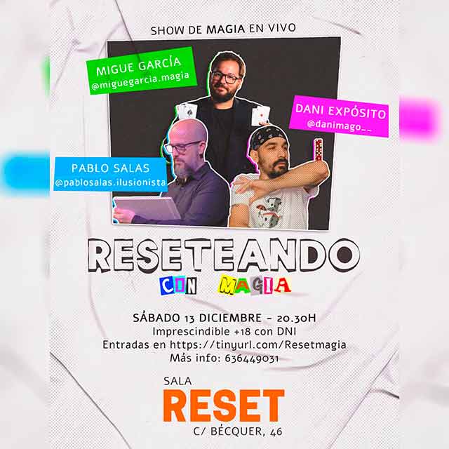 Qué: el sábado 13 de diciembre de 2025 se estrenará el espectáculo "Reseteando con magia" en la Sala Reset de Sevilla. Es una propuesta de una hora y media aproximada de duración protagonizada por los magos Migue García, Dani Expósito y Pablo Salas. Consulta la agenda con otras actividades en Sevilla.