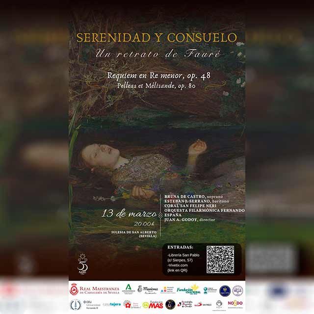 Qué: el viernes 13 de marzo de 2026 se ha programado el concierto "Serenidad y consuelo. Un retrato de Fauré" en la iglesia de San Alberto de Sevilla. Se interpretarán las obras "Requiem en Re menor, opus 48" y "Pelleas et Mélisande, opus 80". La Coral San Felipe Neri, la Orquesta Filarmónica Fernando España, Bruna de Castro (soprano) y Esteban Serrano (barítono) actuarán dirigidos por Juan A. Godoy. Consulta la agenda completa de conciertos en Sevilla.