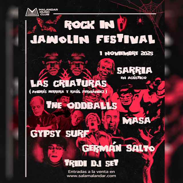 Qué: el sábado 1 de noviembre de 2025 se celebrará Rock in Jawolin Festival en la Sala Malandar de Sevilla. Actuarán las bandas Sarria (en acústico), Las criaturas (Andrés Herrera "Pájaro" y Raúl Fernández), The Oddballs, Masa, Gypsy surf, Germán Salto y Tridi DJ set. Consulta la agenda completa de conciertos en Sevilla.