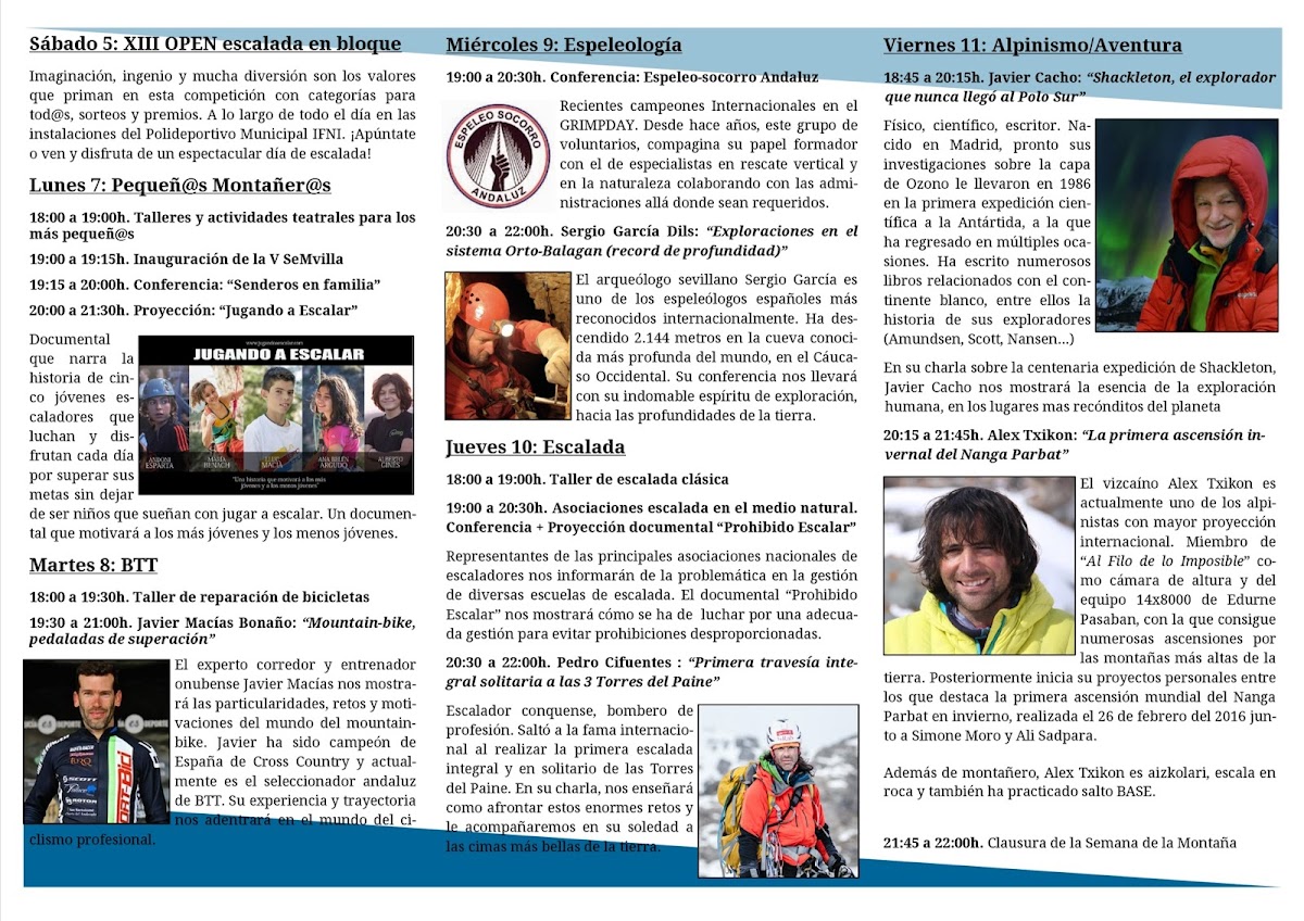 Qué: del lunes 7 al viernes 11 de noviembre de 2016 tendrá lugar la quinta edición de la Semana de la Montaña de Sevilla que este año cambiará su sede al Teatro Hogar Virgen de los Reyes de Sevilla. Contará con talleres, proyecciones y conferencias entre las que destacan las del alpinista Alex Txikon y Javier Cacho. Cada día estará dedicado a una temática: lunes a los "Pequeños Montañeros" con actividades infantiles, martes a la BTT (bicicleta todo terreno) o bicicleta de montaña, miércoles a la espeleología, jueves a la escalda y viernes al alpinismo y la aventura. Puedes descargar la programación completa.