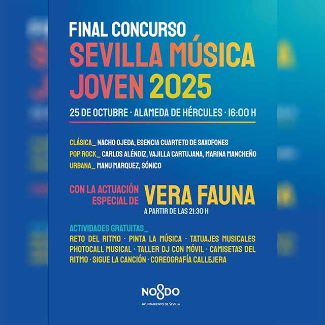 Qué: el sábado 25 de octubre de 2025 se celebrará la final del concurso "Sevilla música joven 2025" en la Alameda de Hércules de Sevilla. Además de las competiciones en música clásica, pop rock y urbana, habrá actividades y un concierto de Vera Fauna. Consulta la agenda completa de conciertos en Sevilla.