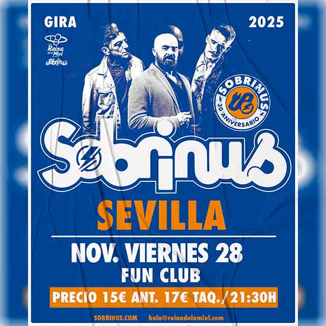 Qué: el viernes 28 de noviembre de 2025 habrá un concierto de la banda Sobrinus en la Sala FunClub de Sevilla. El trío madrileño de rock alternativo formado por Sydney Gámez (cantante y guitarra), David Parrila (batería) y Javi Fernández (bajo) se fundó en el año 1995. La cita en nuestra ciudad forma parte de la celebración de su trigésimo aniversario en el mundo de la música. Consulta la agenda completa de conciertos en Sevilla.