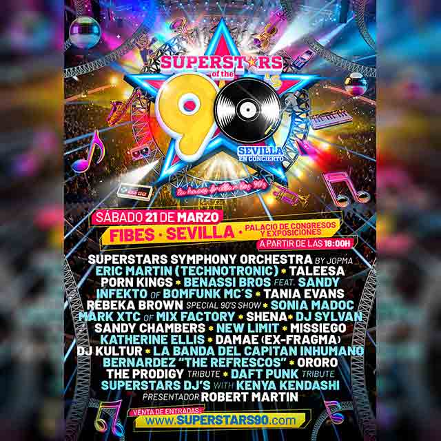 OnSevilla. El sábado 21 de marzo de 2026 se ha programado en Sevilla una nueva edición del concierto "SuperStars of the 90's" en el pabellón 3 del Palacio de Exposiciones y Congresos de Sevilla (Fibes). Será la primera vez que se celebre en este escenario, que dispone de una pista de baile mayor. El espectáculo estará presentado por Robert Martin y contará con las actuaciones de Eric Martin (Technotronic), Taleesa, Infekto of Bomfunk Mc's, Bernardez "The Refrescos", La banda del capitán Inhumano y tributos a The Prodigy y Daft Punk, entre otras. Consulta la agenda completa de conciertos en Sevilla.