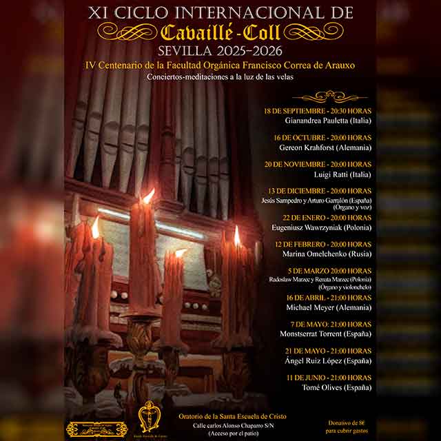 OnSevilla. Del jueves 18 de septiembre de 2025 al jueves 11 de junio de 2026 se desarrollarán los conciertos de la undécima edición del Ciclo Internacional del Órgano Cavaillé-Coll (conciertos-meditaciones a la luz de las velas) en el Oratorio de la Santa Escuela de Cristo de