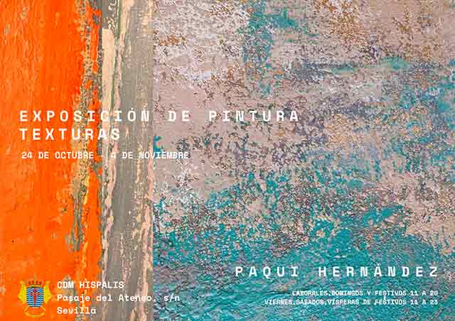 Qué: del viernes 24 de octubre al martes 4 de noviembre de 2025 estará abierta al público la exposición temporal "Texturas" en el Centro Deportivo Sociocultural Militar "Hispalis" (Casino Militar) de Sevilla. Se trata de una muestra individual en la que se exhiben obras de la pintora Paqui Hernández. Consulta la agenda completa de exposiciones en Sevilla.