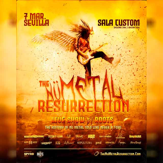 Qué: el sábado 7 de marzo de 2026 se ha programado The Nu Metal Resurrection (live show by Roots) en la Sala Custom de Sevilla. En este concierto de dos horas de duración se repasarán temas de grupos como Rage against the machine, Korn, Limpbizkit, System of a down, Linkin Park y Slipknot, entre otros. Consulta la agenda completa de conciertos en Sevilla.