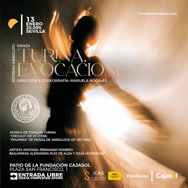 Qué: el martes 13 de enero de 2026 será el estreno absoluto del espectáculo de danza "Turina evocaciones" en el patio de la Fundación Cajasol de Sevilla. Es una propuesta con música de Joaquín Turina coreografiado y dirigido por Manuela Nogales. Consulta la agenda completa de conciertos en Sevilla.