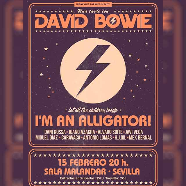 Qué: el domingo 15 de febrero de 2026 tendrá lugar una nueva edición del concierto "Una tarde con David Bowie" en la Sala Malandar de Sevilla. El grupo I'm an alligator formado por los músicos Dani Kussa, Juano Azagra, Álvaro Suite, Javi Vega, Miguel Díaz, Caravaca, Antonio Lomas, H.J.Gil y Mex Bernal repasará la discografía del británico David Bowie. Consulta la agenda completa de conciertos en Sevilla.
