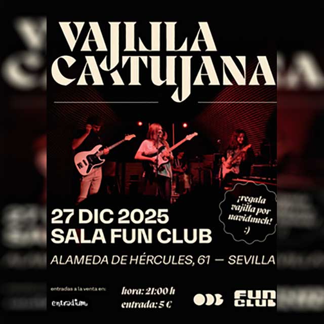 Qué: el sábado 27 de diciembre de 2025 habrá un concierto de Vajilla Cartujana en la sala FunClub de Sevilla. La banda sevillana de pop-punk presentará los temas de su primer EP "J de Judas", que publicarán el 5 de diciembre. Consulta la agenda completa de conciertos en Sevilla.