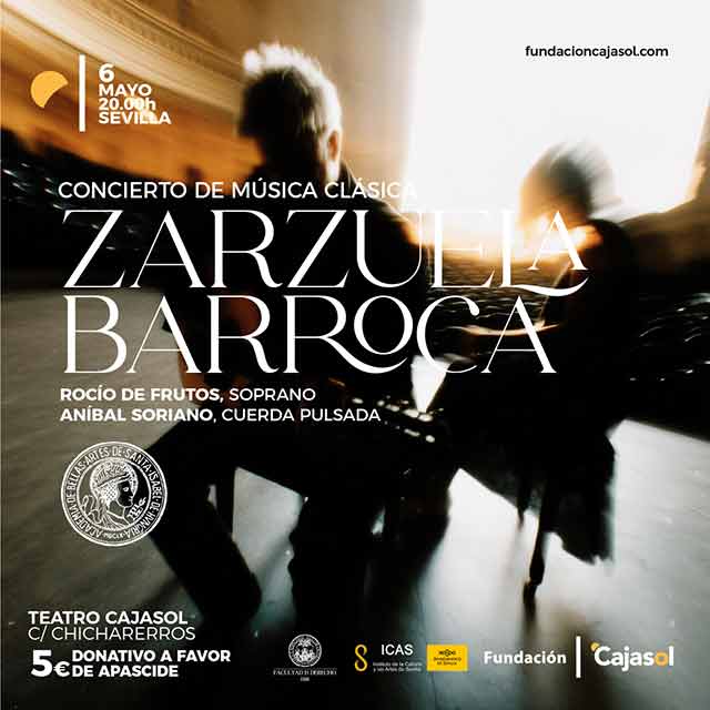 Qué: el miércoles 6 de mayo de 2026 se podrá asistir al concierto benéfico "Zarzuela barroca" en el Teatro Cajasol de la Fundación Cajasol en Sevilla. Rocío de Frutos (soprano) y Aníbal Soriano (cuerda pulsada) interpretarán piezas de música clásica para recaudar fondos para Apascide (Asociación Española de Familias de Personas con Sordoceguera). Consulta la agenda completa de conciertos en Sevilla.
