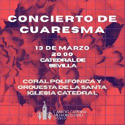 El viernes 13 de marzo de 2026 en la Catedral de Sevilla se ha programado un concierto de Cuaresma de la Coral Polifónica y la Orquesta de la Santa Iglesia Catedral.